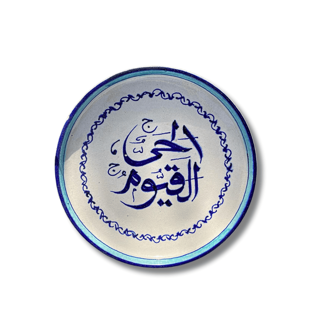 This exquisite ceramic plate features beautifully hand-painted Arabic calligraphy of “Al-Hayy Al-Qayyum,” two of the 99 Names of Allah, meaning “The Ever-Living, The Sustainer of All” The deep blue script stands out against a pristine white background, encircled by a delicate, ornate border in complementary shades of blue. Perfect for adding a touch of spiritual elegance and artistic heritage to any home decor. Each plate is a unique piece, reflecting traditional craftsmanship.