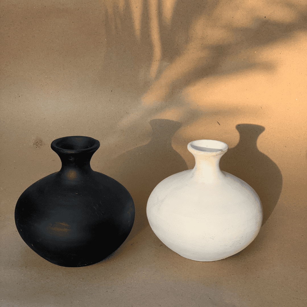 A stunning set of two rounded vases—one matte black and one pure white. They stand side-by-side, creating a beautiful, modern contrast.