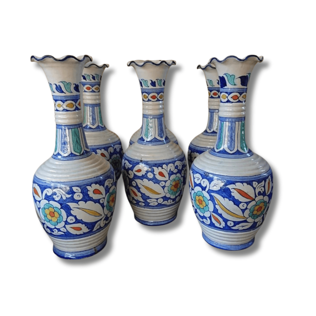 Adorn your space with the timeless elegance of our Bel Bahaar Jar. These stately, tall vases are entirely covered in a mesmerizing hand-painted blue and white vine (Bel) pattern, reminiscent of a flourishing spring garden. Ideal as sophisticated floor vases, they infuse any room with classic charm and intricate Sindhi artistry.