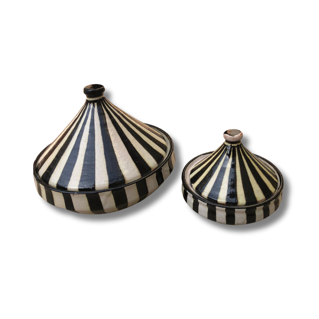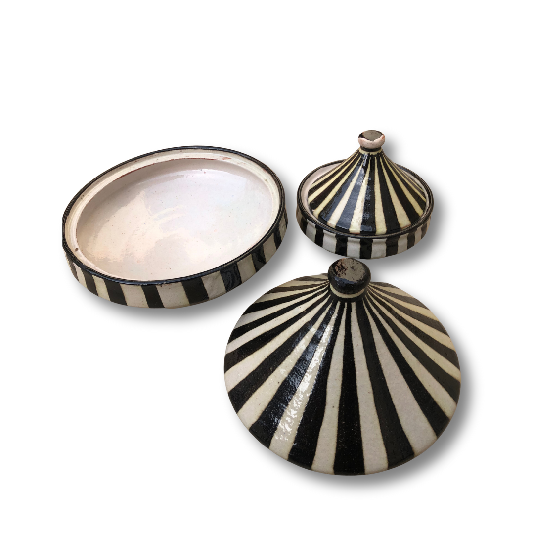 A decorative ceramic container styled after a Moroccan tagine. The lid and base are covered in bold, graphic black and white vertical stripes.