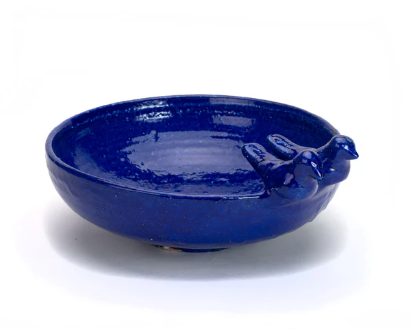 A striking, deep emerald-blue ceramic bowl featuring a textured basketweave pattern and three perched ceramic birds. Perfect as a unique centerpiece or a decorative bird bath.