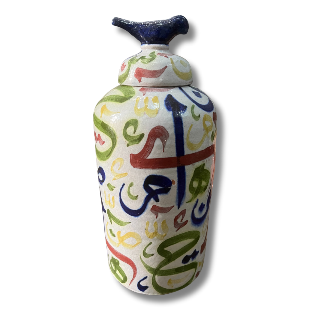 Celebrate the beauty of the written word. This elegant ceramic jar is adorned with colorful, fluid Arabic-style calligraphy. Topped with a deep blue bird handle, it’s a soulful piece of art that blends history with home decor.