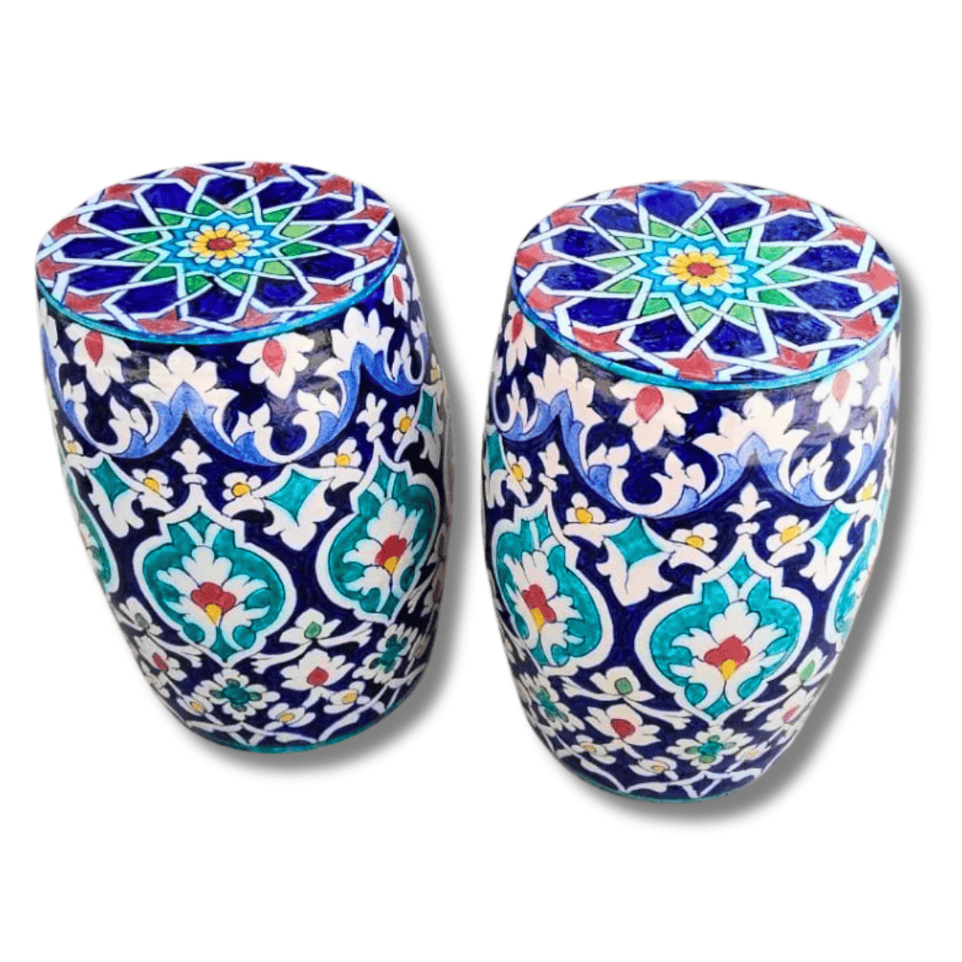An eye-catching, hand-painted ceramic stool with a detailed, colorful floral design (red, teal, and blue). The best part is the top, which features an intricate, geometric mosaic star pattern.