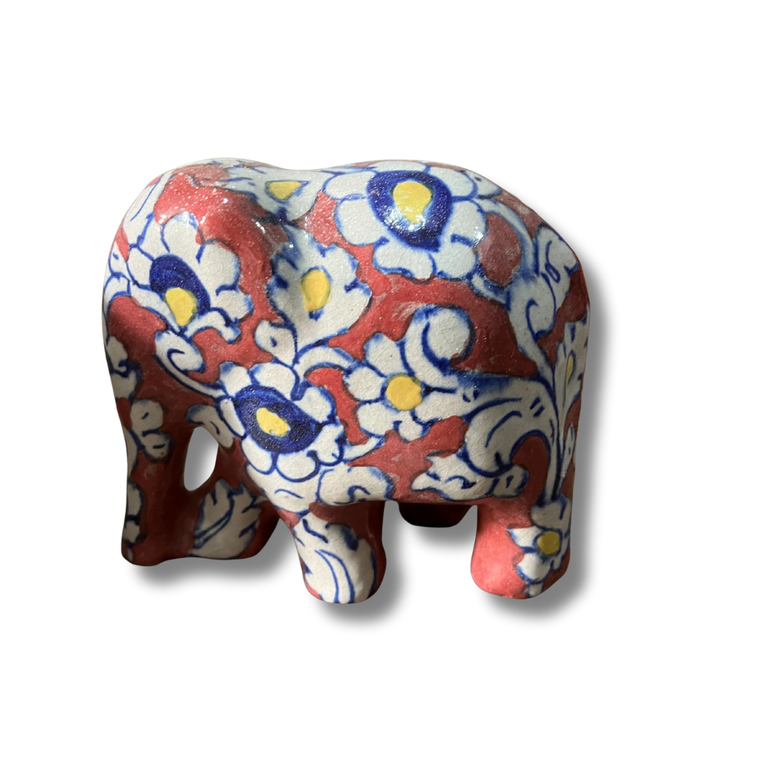 This handcrafted ceramic elephant is “dressed” in a dense, beautiful pattern of indigo blue and yellow flowers against a terracotta base. A sturdy, soulful piece for any desk or mantle.