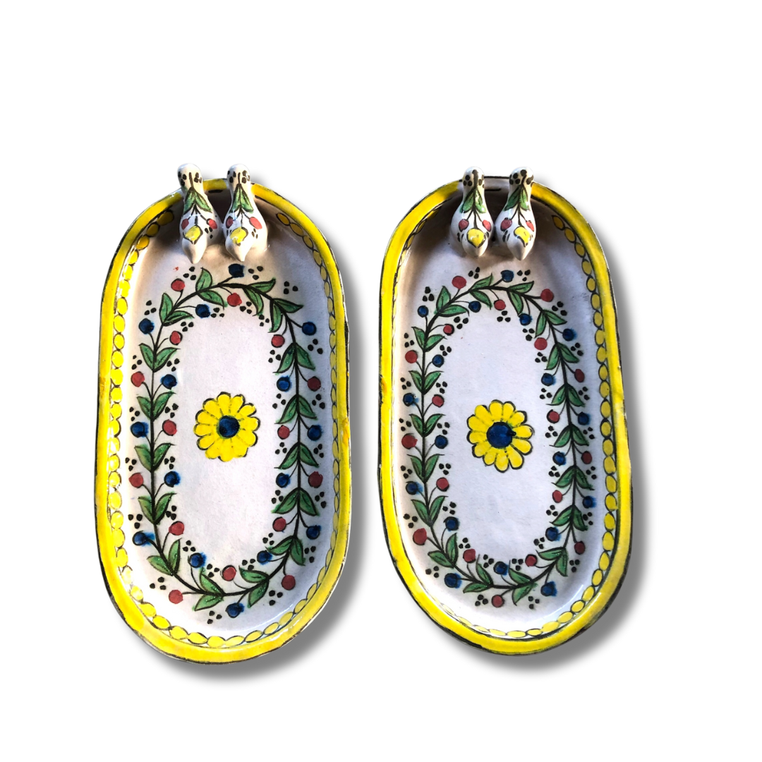 Decorative oval platter with a bright yellow rim. The center is hand-painted with a pattern of berries, leaves, and a bright yellow flower. The unique piece is finished with two small ceramic birds sitting on the rim.