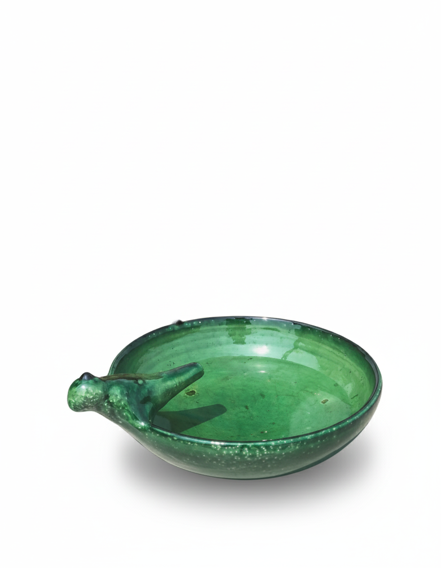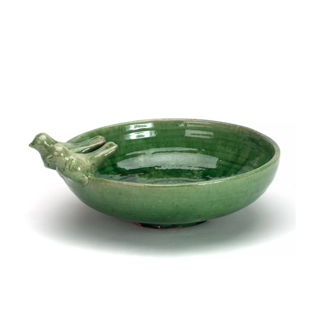 A striking, deep emerald-green ceramic bowl featuring a textured basketweave pattern and three perched ceramic birds. Perfect as a unique centerpiece or a decorative bird bath.