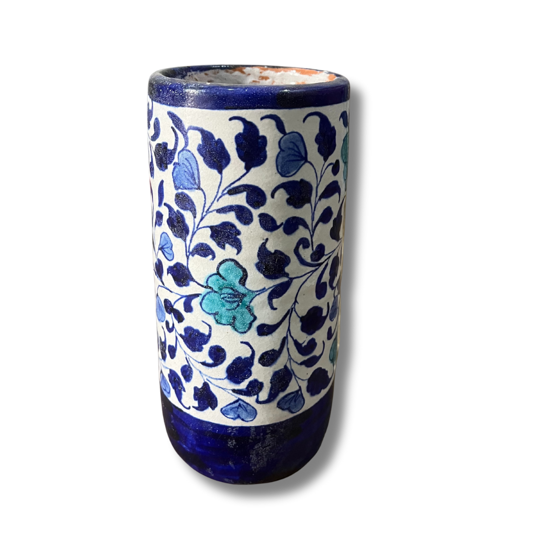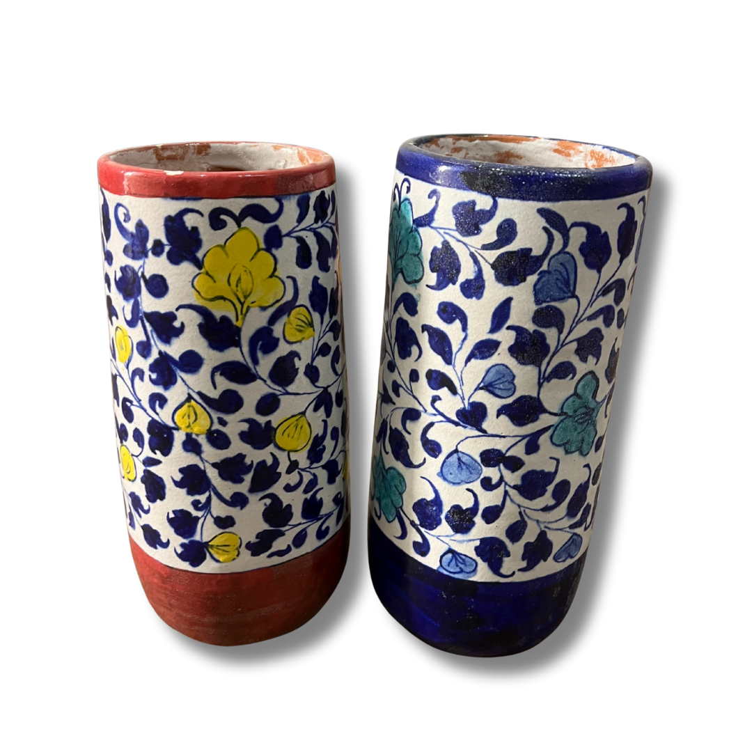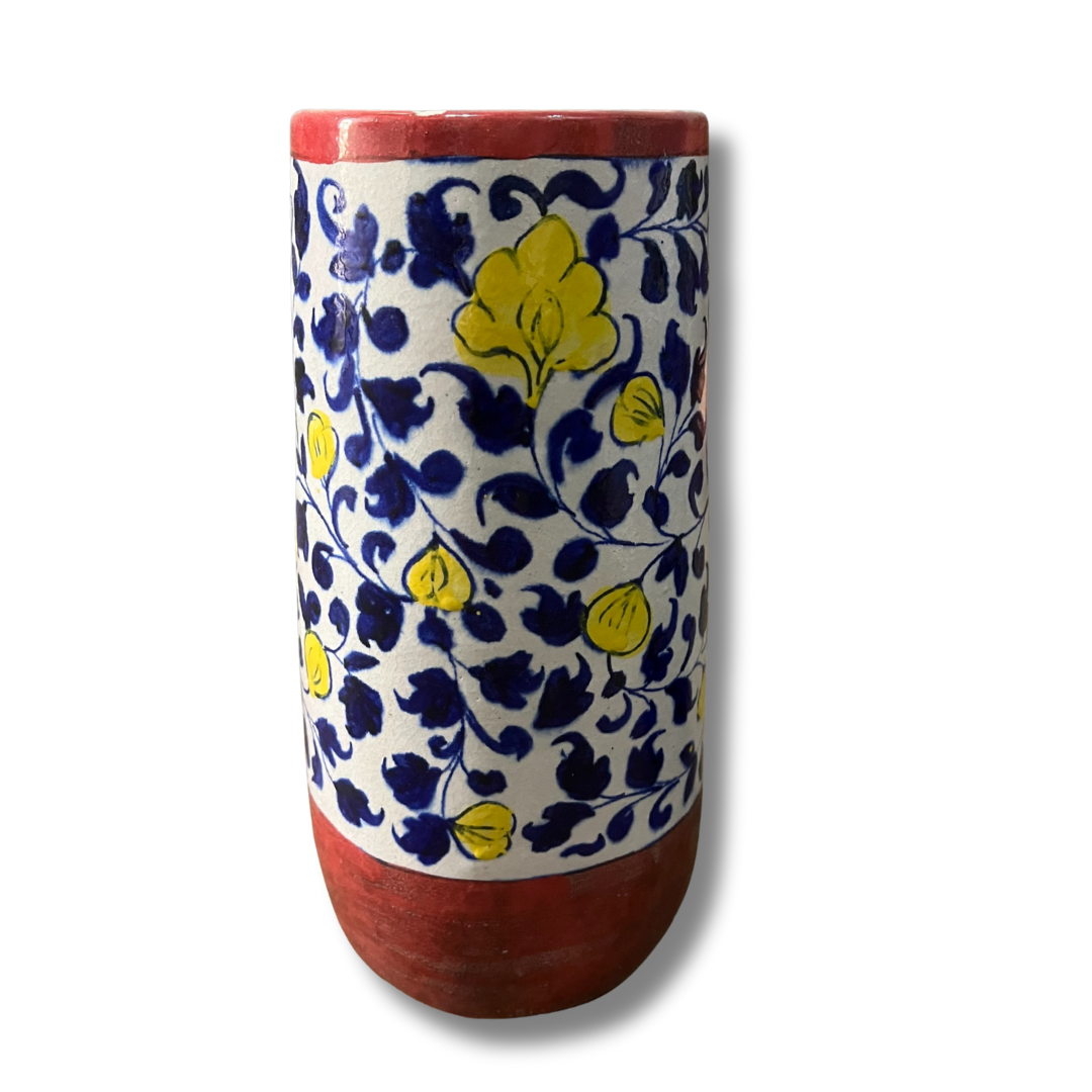 These vibrant cylindrical vases showcase the classic floral vine patterns of Sindh. Choose between a bold terracotta red or a deep royal blue base, both adorned with hand-painted yellow and teal blossoms that bring a burst of color to any corner.