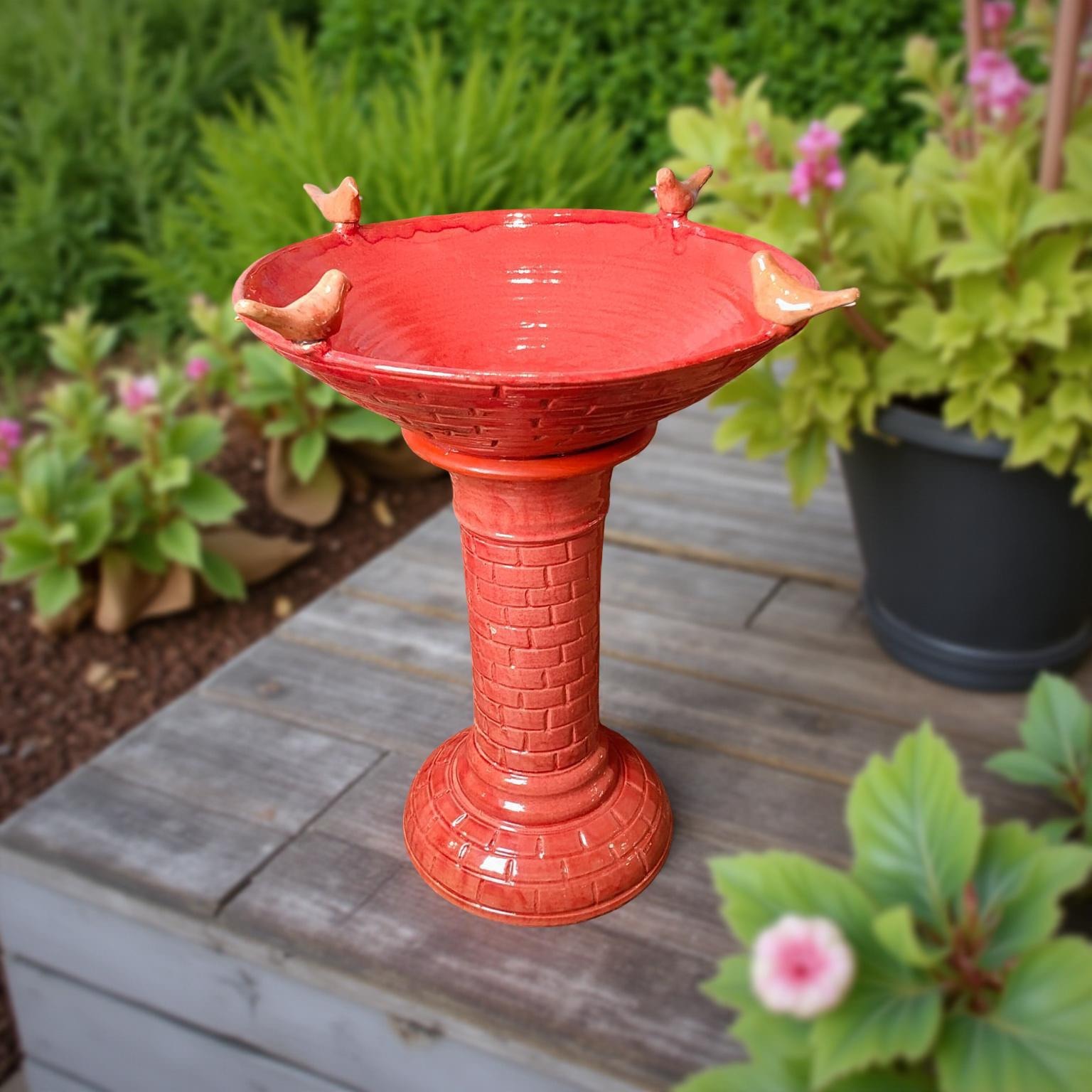 A beautifully handcrafted ceramic bird bath fountain in a rich red glaze, detailed with charming bird figures on the rim. Designed with a sturdy brick-textured pedestal, it brings a warm, artisanal touch to any garden, patio, or balcony. This versatile piece can also be used as a small decorative fountain, adding the soothing sound of water to your outdoor space while welcoming birds to refresh and play.