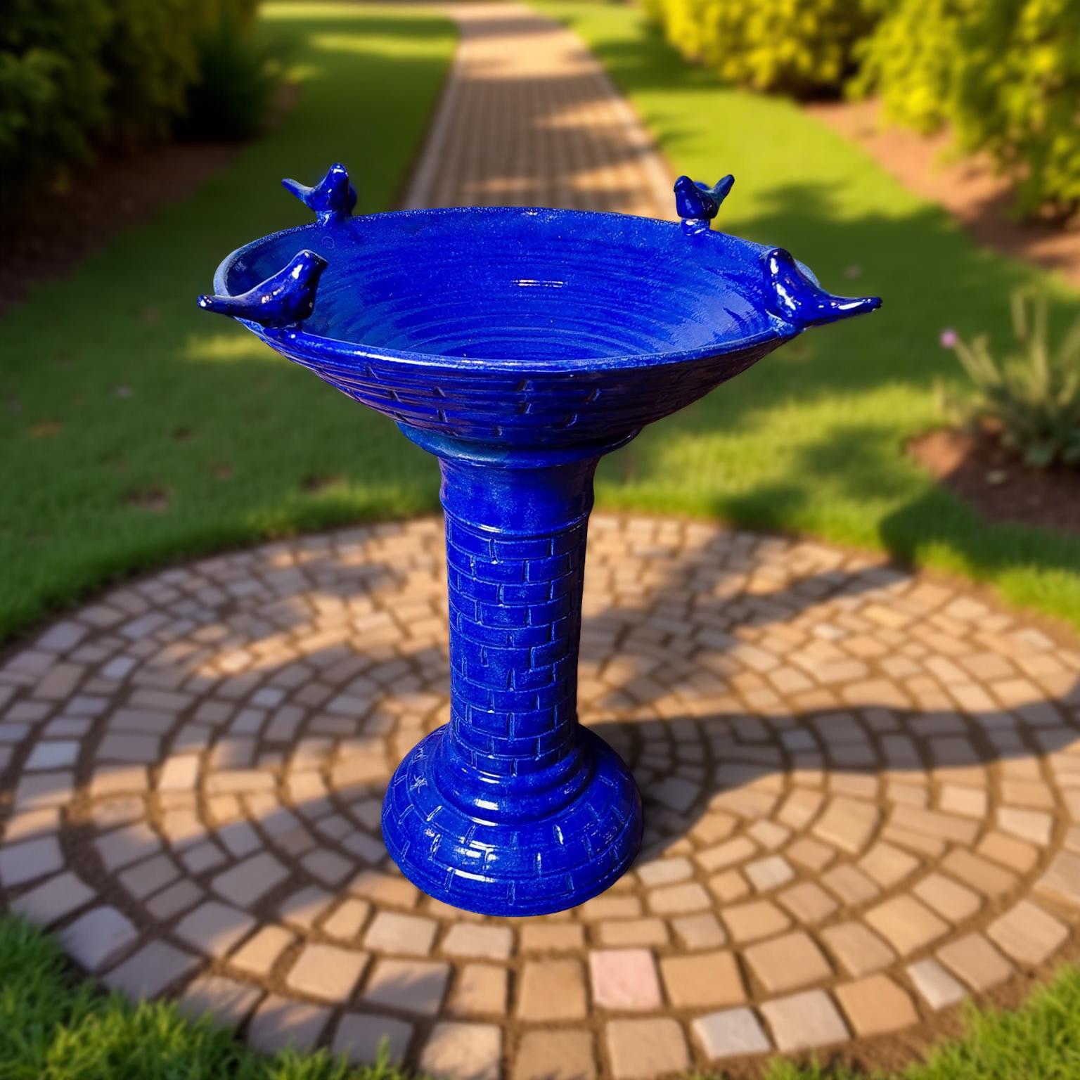 A beautifully handcrafted ceramic bird bath fountain in a rich turquoise glaze, detailed with charming bird figures on the rim. Designed with a sturdy brick-textured pedestal, it brings a warm, artisanal touch to any garden, patio, or balcony. This versatile piece can also be used as a small decorative fountain, adding the soothing sound of water to your outdoor space while welcoming birds to refresh and play.