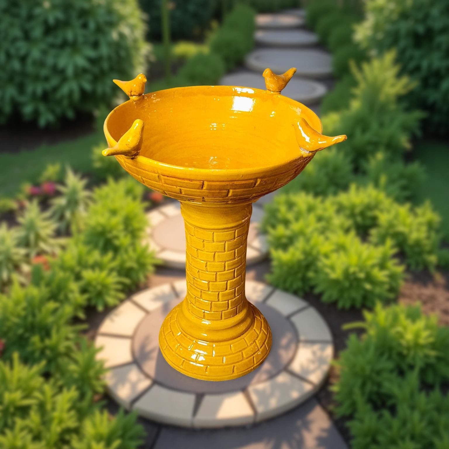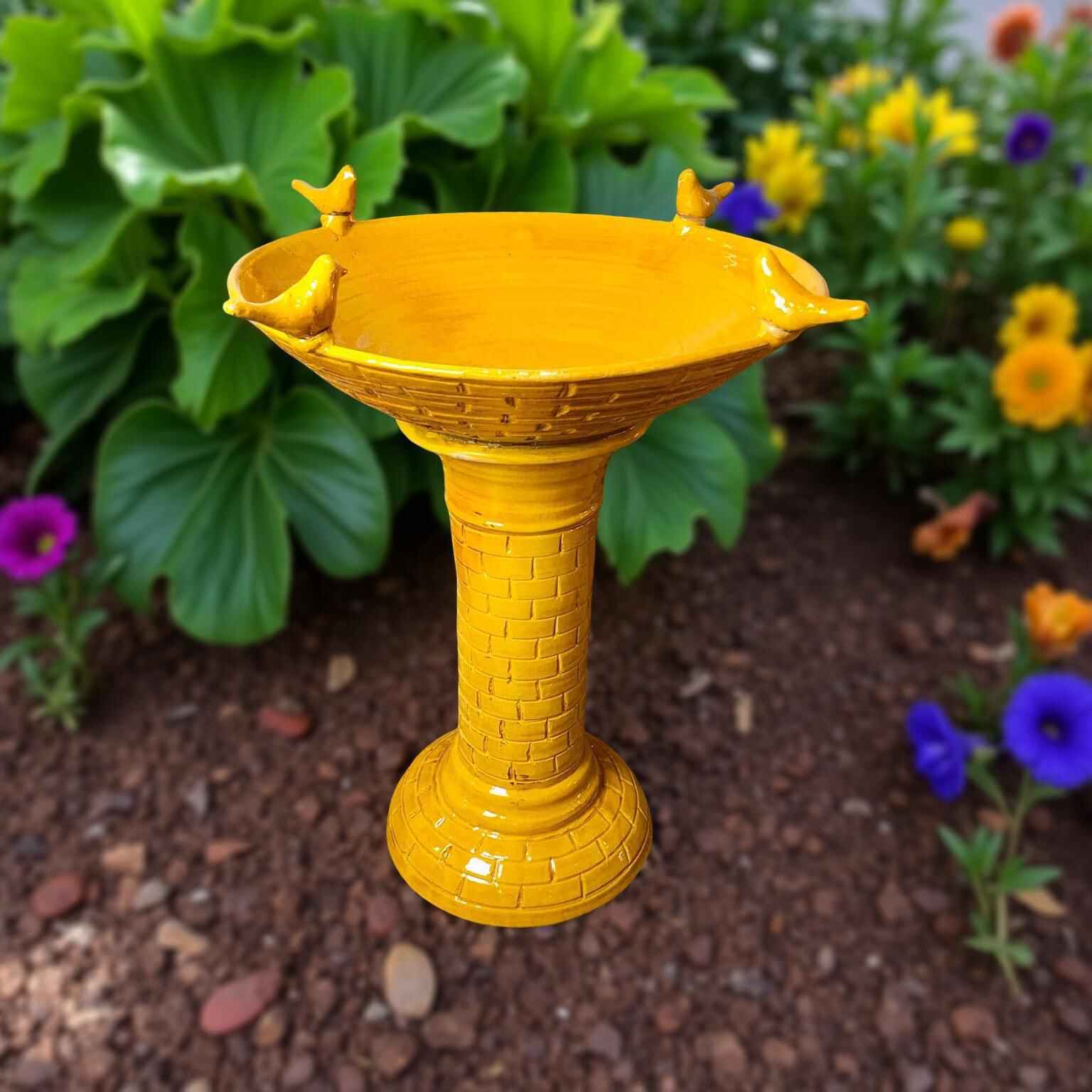 A beautifully handcrafted ceramic bird bath in a rich mustard glaze, detailed with charming bird figures on the rim. Designed with a sturdy brick-textured pedestal, it brings a warm, artisanal touch to any garden, patio, or balcony. This versatile piece can also be used as a small decorative fountain, adding the soothing sound of water to your outdoor space while welcoming birds to refresh and play.