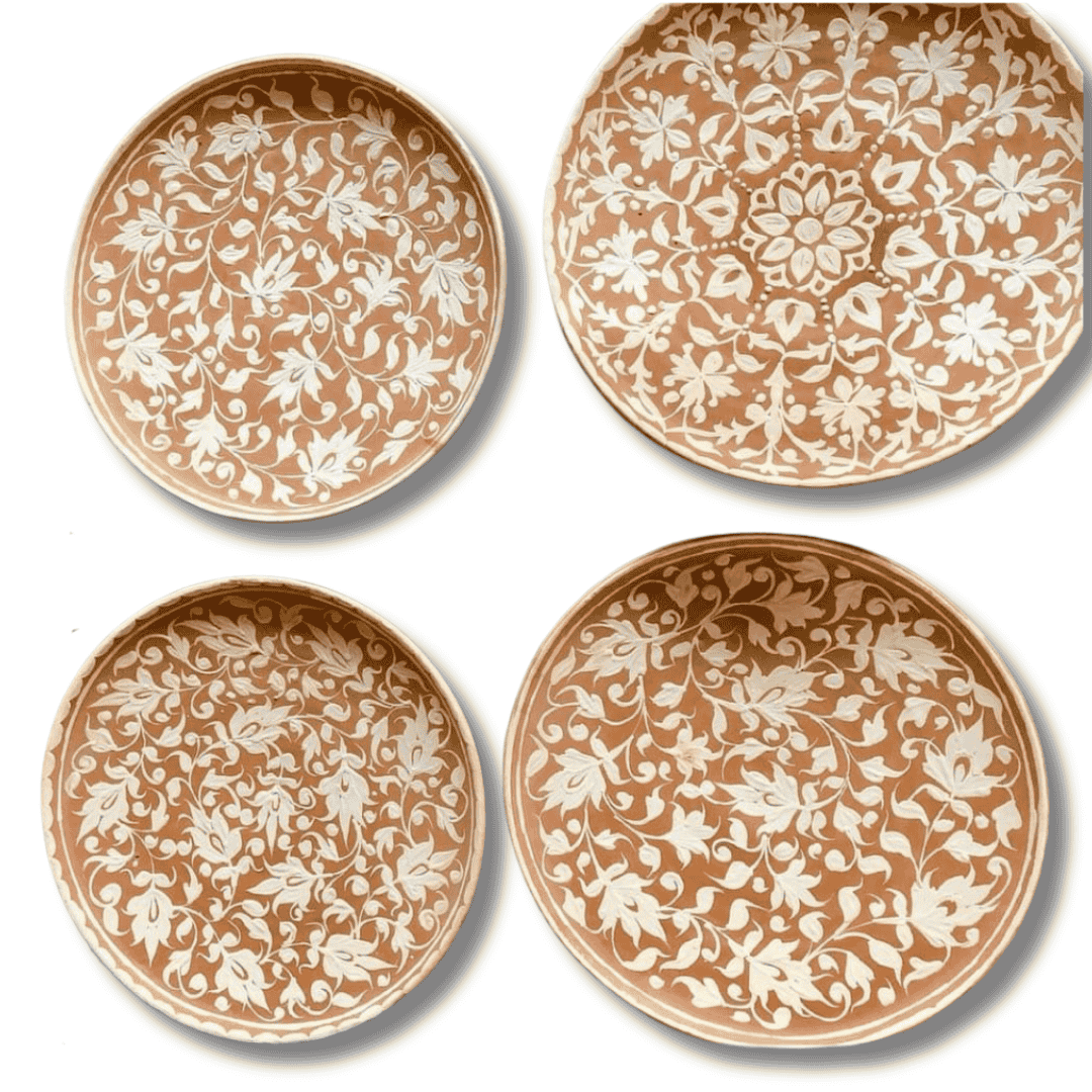 Showcasing the raw beauty of natural terracotta, these unglazed platters feature an intricate white floral Gulkar design. A unique piece of Sindhi folk art, perfect as a stunning wall hanging or earthy decor accent.