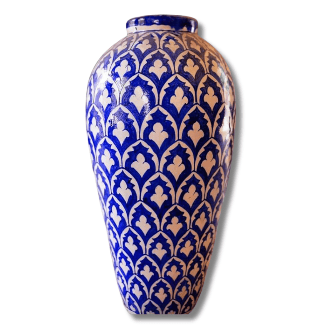 Introducing the captivating Mughal Patra Guldaan. This elegant vase features a mesmerizing, hand-painted repeating pattern of stylized blue and white leaves or petals (Patra), echoing the timeless beauty of Mughal design. Perfect as a sophisticated accent piece, it brings an intricate and classic artistic flair to any shelf, table, or mantel.