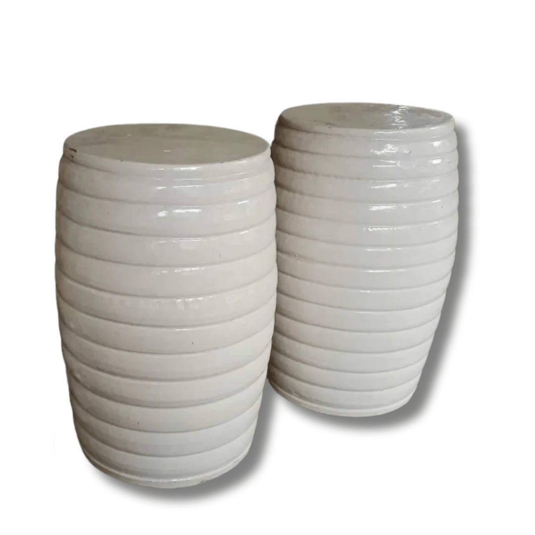 This modern ceramic stool has a simple, classic barrel shape. It’s finished in a smooth, shiny white and other glazesĀ and features a subtle ribbed texture running all the way around. It’s a clean, versatile piece for any room or garden.