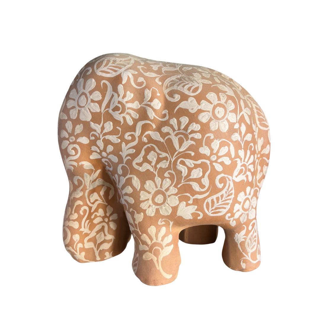 Celebrate the raw beauty of natural clay. This elephant figurine is meticulously hand-painted with white floral vines directly onto the warm terracotta surface. It has a lovely matte feel that highlights the authentic craftsmanship of the region.