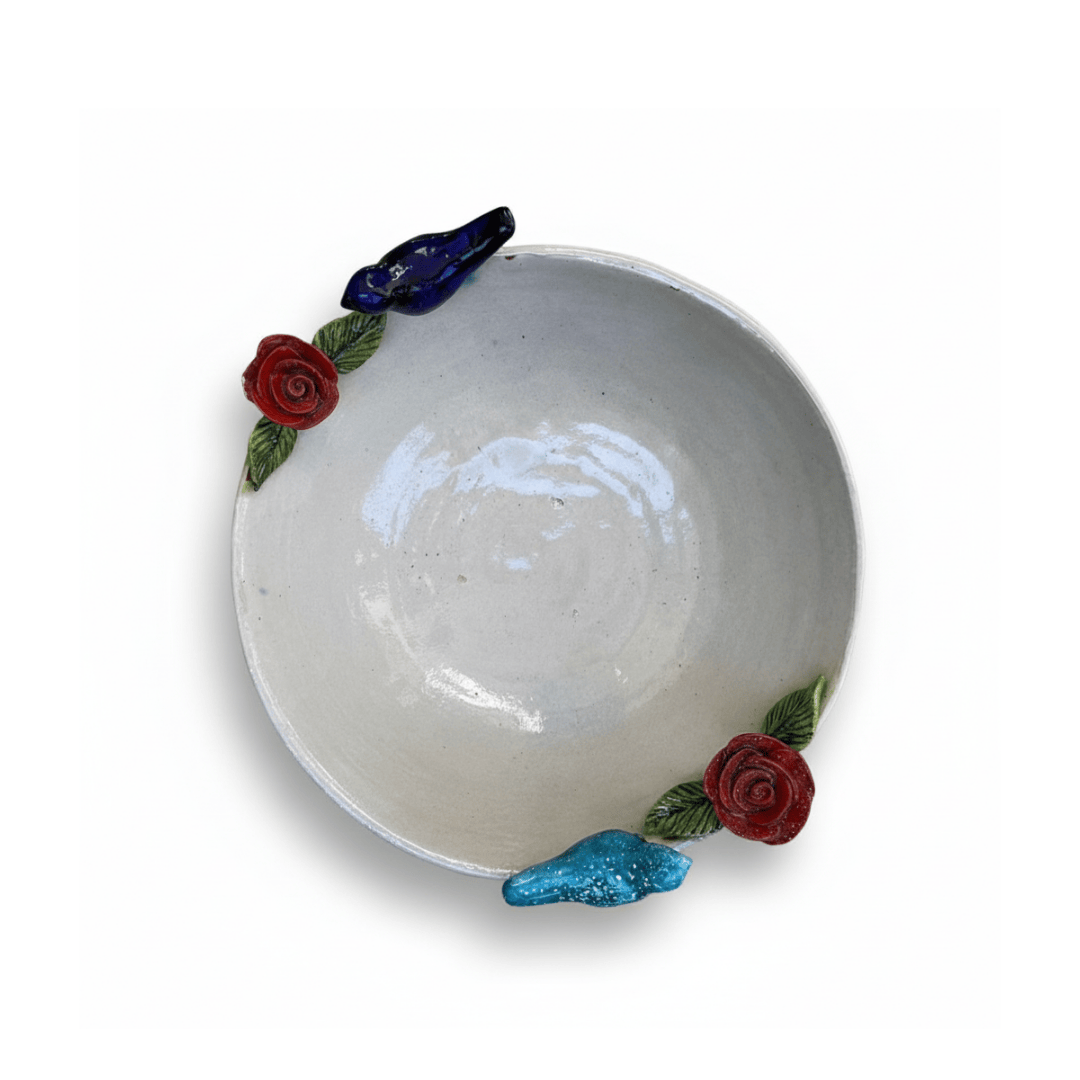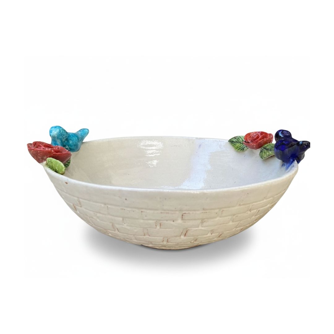 A stunning white ceramic decorative bowl with a delicate basket weave texture. Adorned with sculpted blue and navy birds, red roses, and a floating floral arrangement, this piece captures the tranquility of a springtime garden.